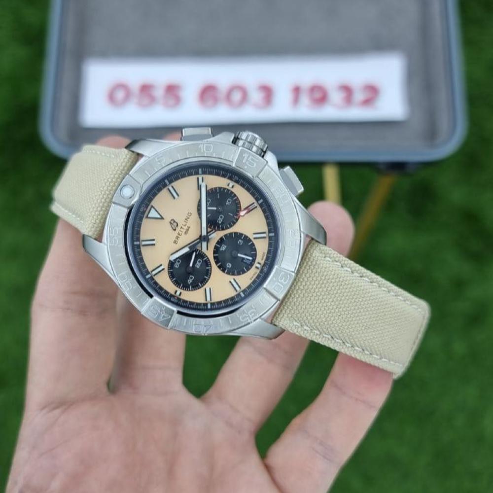 برايتلينغ كرونوغراف تقليد درجة أولى، بطارية، مقاس 42 ملم، بمينا بيج أنيق وعدادات كرونوغراف بلون أسود، وسوار قماشي خفيف وناعم بلون بيج فاتح.