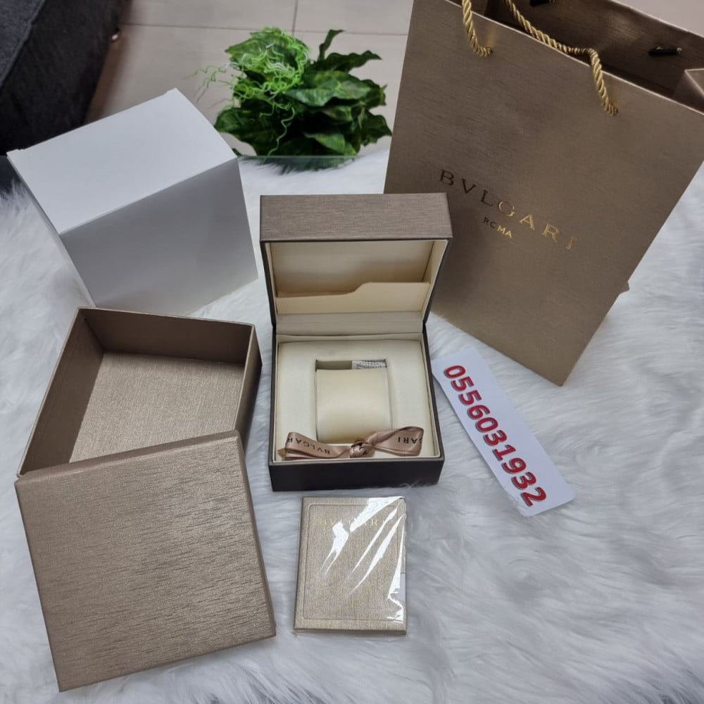 علبة بولغاري تجمع بين الفخامة والأناقة، تصميمها الراقي يخلي ساعتك محفوظة بطريقة مرتبة وفخمة. جايه بلون ذهبي برونزي أنيق مع شعار BVLGARI محفور بلمسة كلاسيكية.