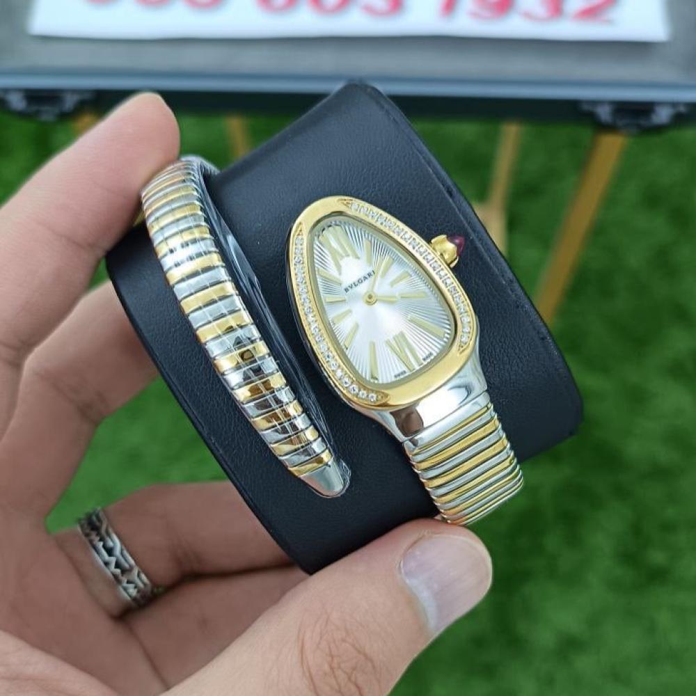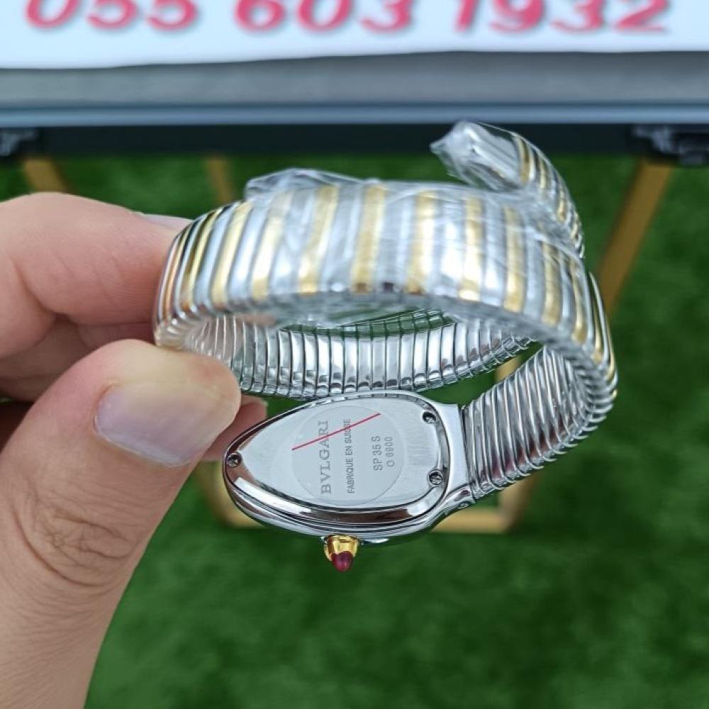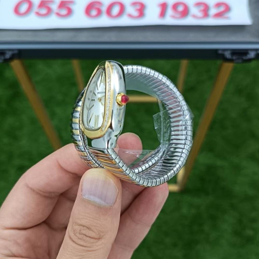 ساعة بولغاري سيربنتي تقليد درجة أولى بطارية – مقاس 28×29، شكل الأفعى الأنيق مع سوار معدني بلونين (ذهبي × فضي) ومينا فضي جذاب، والإطار مرصع بأحجار براقة تعكس الفخامة في كل لمسة.