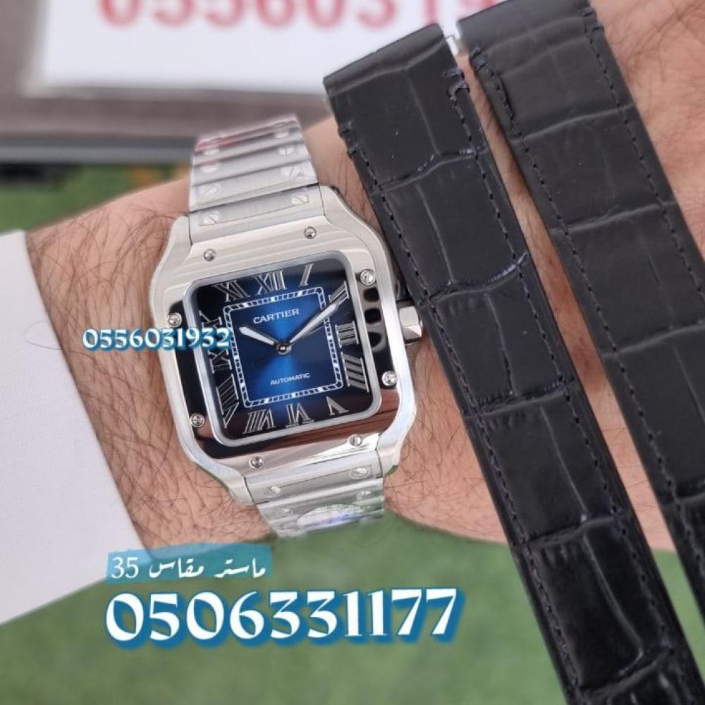ساعة سانتوس دو كارتييه ماستر طبق الاصل تجمع بين التصميم الكلاسيكي والمتانة العصرية، حيث تتميز بواجهة مربعة من الفولاذ المقاوم للصدأ وميناء أزرق يتناغم مع الأرقام الرومانية البيضاء. تأتي مع سوارين مختلفين: واحد معدني وآخر جلدي أسود إضافي، مما يسمح لك بتغيير المظهر بسهولة حسب الرغبة. تعمل بنظام الحركة الأوتوماتيكية الذي يعتمد على حركة اليد، مما يوفر تجربة استخدام سلسة دون الحاجة إلى تغيير البطاريات.