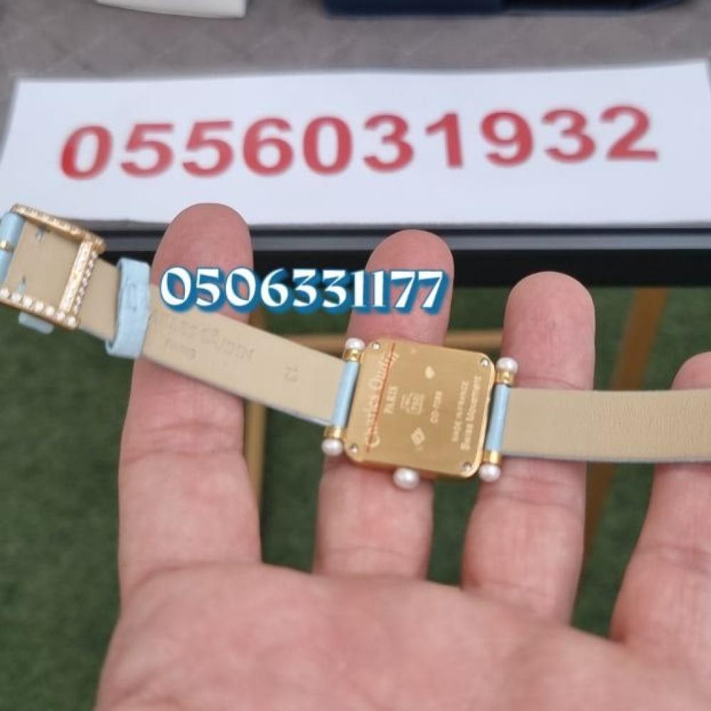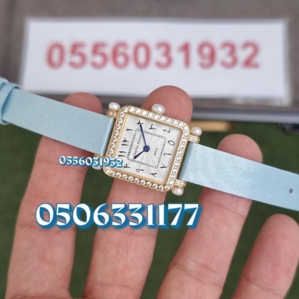 ساعة بانسي ريترو من تشارلز أودين بعلبة مربعة مرصعة بفصوص براقة وسوار ستان حريري بلون سماوي ناعم، مثالية لإطلالة أنثوية راقية.