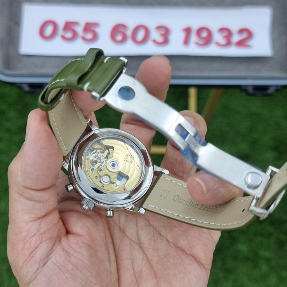 ساعة باتيك فيليب جراند كومبليكيشن تقليد درجة أولى – ماكينة أوتوماتيك تصميم أنيق بميناء اسود ووظائف متعددة مع سوار جلد أخضر أنيق، تجمع بين الرقي والفخامة.