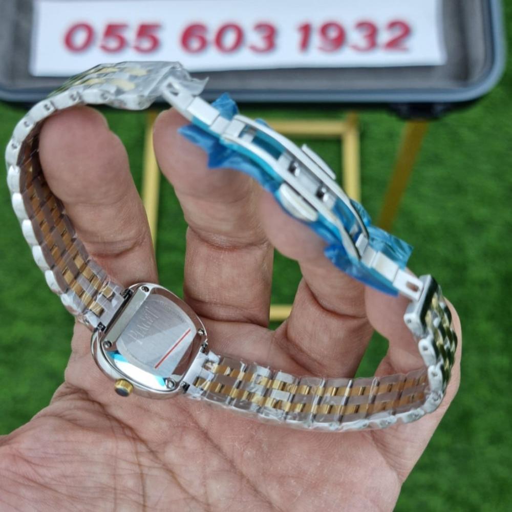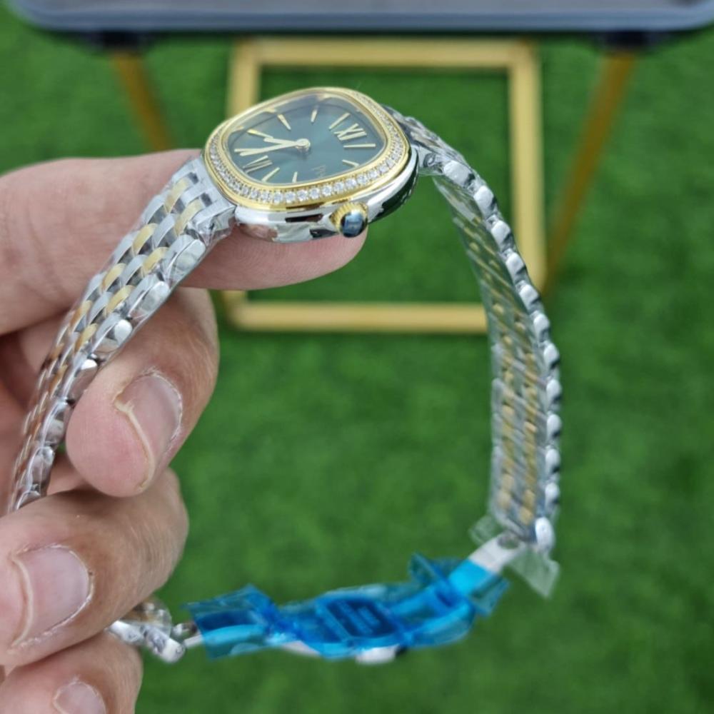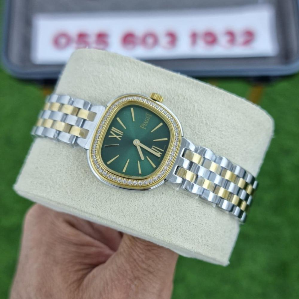 هذي ساعة بياجيه سيكستي مقاس 29 تجي بتصميم ناعم وفخم بنفس الوقت، الميناء لونه أخضر فاخر يلفت الأنظار، والإطار مرصع بفصوص لامعة تضيف لمسة فخمة✨السوار ذهبي فضي مزدوج يعطيها طابع أنثوي راقي، وتناسب كل المناسبات من الرسمية للكاجوال 👑