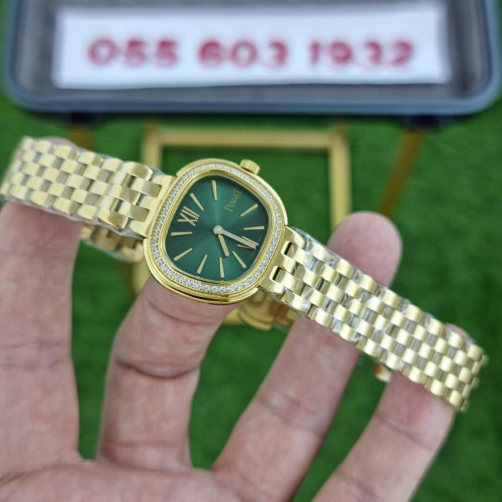 الساعة هذي من موديل بياجيه سيكستي مقاس 29 تجي بجودة عالية وتقليد درجة أولى فخم، لونها ذهبي بالكامل وميناءها أخضر رايق يعطي لمسة فخمة وملفتة. الإطار مرصّع بفصوص براقة تضيف لمعة راقية، وتصميمها أنثوي أنيق يليق بكل المناسبات سواء رسمية أو يومية. ساعة ترفع الإطلالة وتخطف الأنظار على اليد بجمالها.