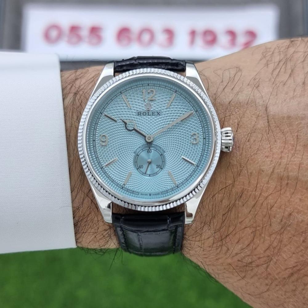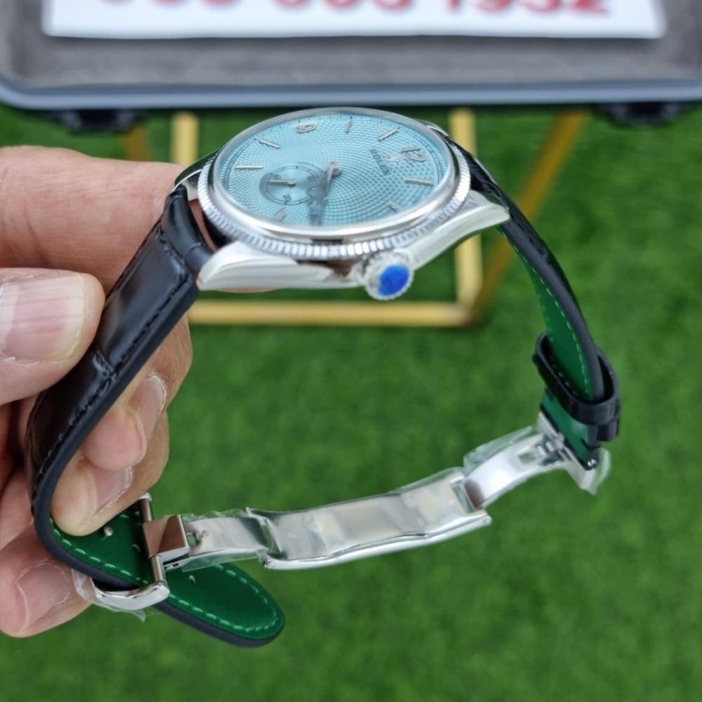 اللي يدور على شكل كلاسيك فخم، هذي الساعة له 👌 رولكس 1908 مقاس 39 أوتوماتيك، تقليد درجة أولى بجودة عالية جدًا. الميناء يجي باللون الأزرق السماوي بتصميم فاخر يلفت الأنظار، والسوار جلد أسود فخم يضيف عليها لمسة فخمة وراقية. تناسب اللبس الرسمي والستايل الكلاسيكي، وتحسها تعطي حضور وأناقة من أول نظرة.