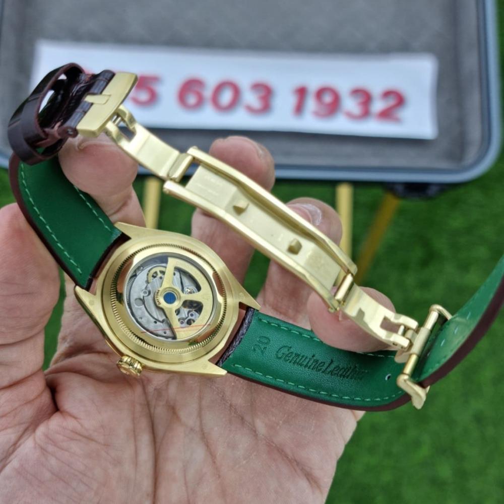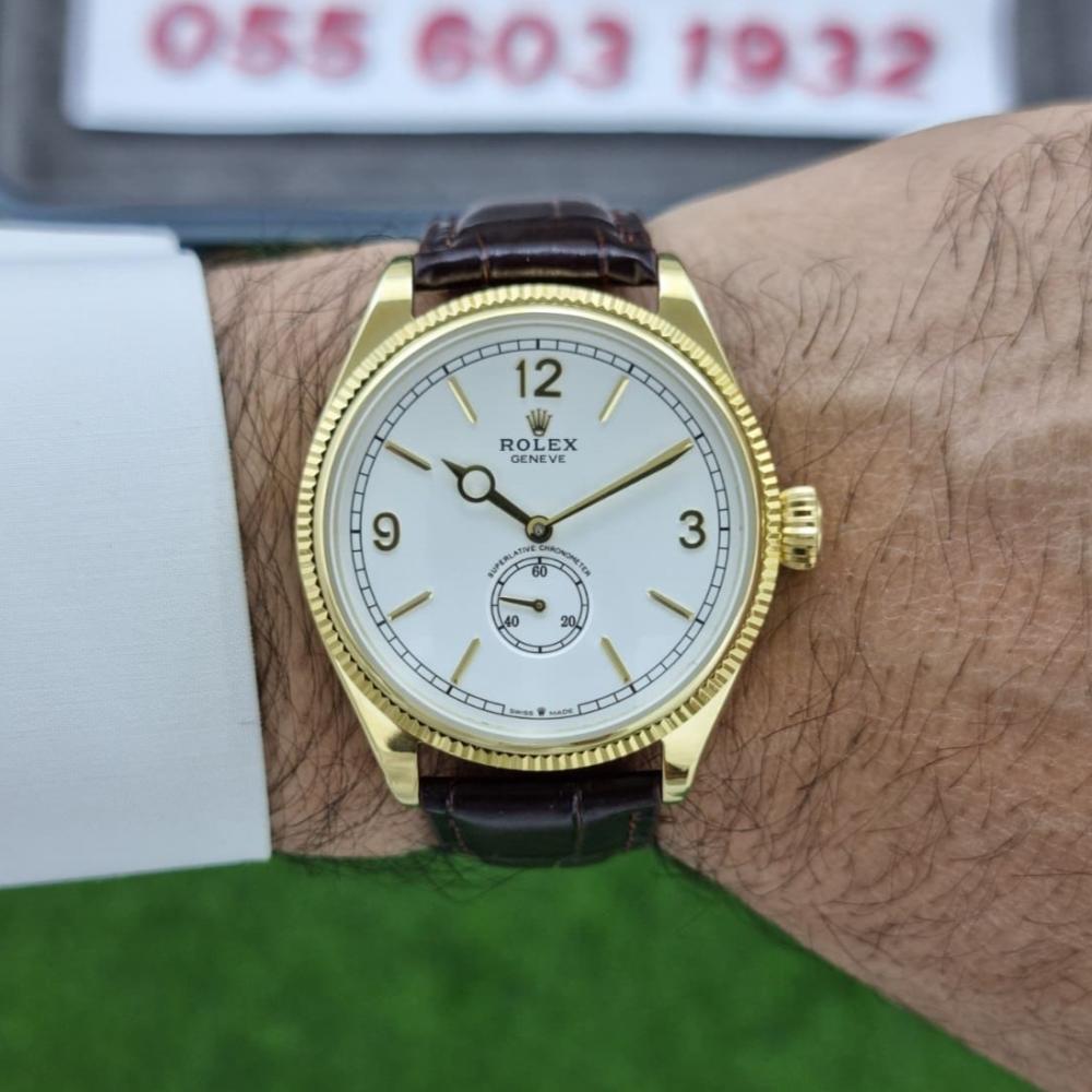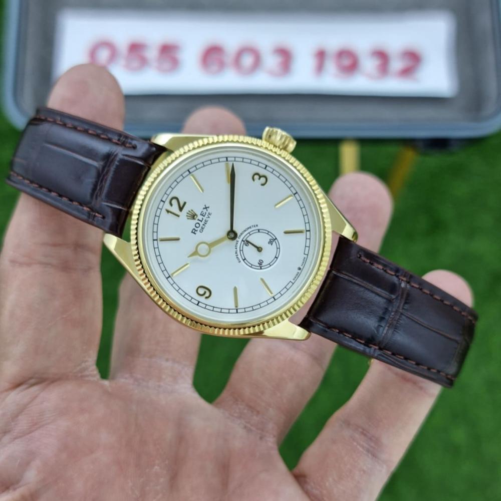 الفخامة تجي بهالشكل 👌 ساعة رولكس 1908 أوتوماتيك تقليد درجة أولى بجودة ممتازة وتصميم كلاسيكي يخطف الأنظار. الإطار ذهبي لامع والميناء أبيض أنيق يعطيها طابع راقٍ جدًا، والسوار جلد طبيعي بني يكمّل جمالها. ساعة تليق بالرجل اللي يحب الستايل الكلاسيكي الفخم.