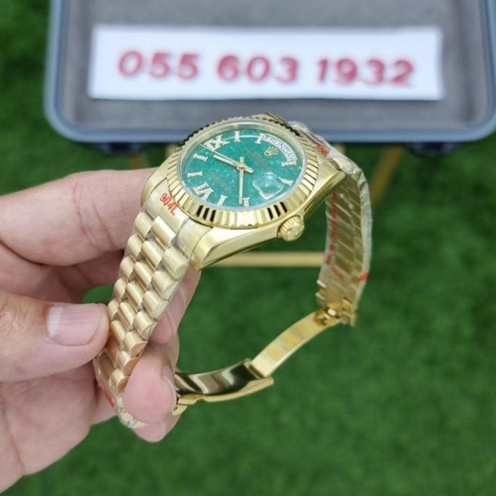 ⌚ ساعة رولكس داي ديت تقليد درجة أولى – مقاس 36 أوتوماتيك، لون ذهبي وميناء زمردي ملكي
