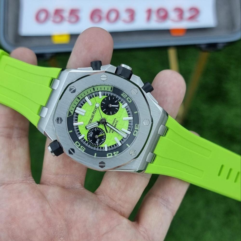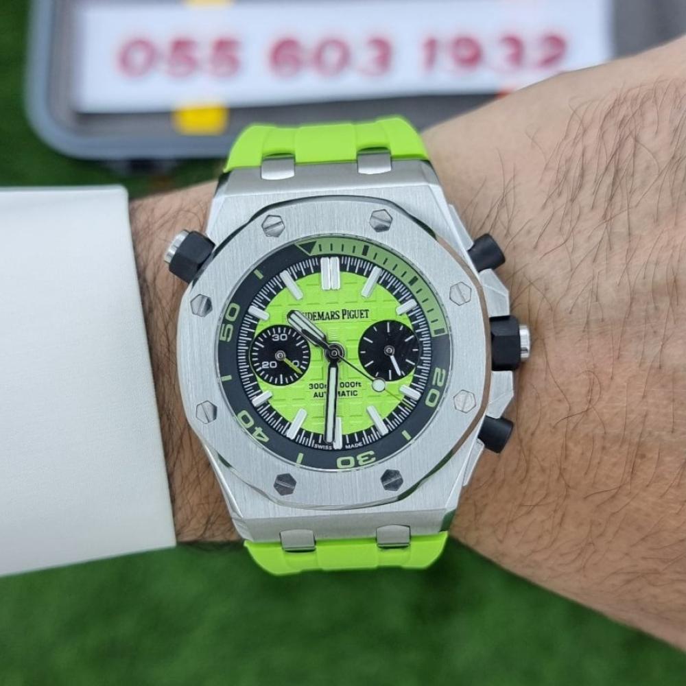 اوديمار بيغيه أوفشور بلون أخضر ناري، تصميم فخم، وكرونوغراف يشتغل بدقة. بطارية قوية وتقفيل درجة أولى، تحسسك إنك لابس شيء نادر، ما تلقاه إلا عند الناس اللي تعرف وش يعني ذوق. ومتوفرة الآن حصريًا عند متجر رومانس، وجهتك الأولى للتميز.