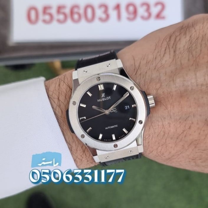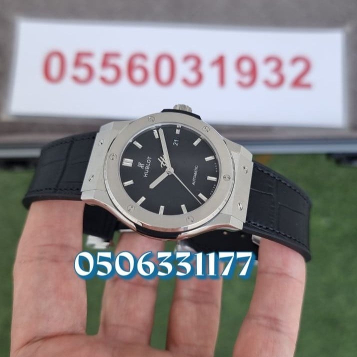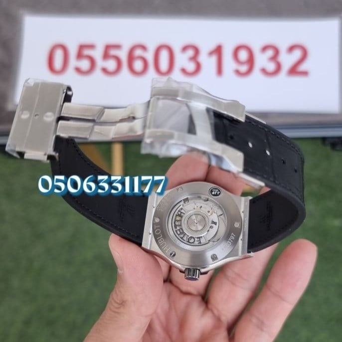 The Hublot Classic Fusion watch combines elegant design with practicality. Its round case made of polished silver metal is of high quality and corrosion resistant, while the black dial stands out with silver details that add a touch of distinction. The black leather strap covered with a rubber strap offers a balance between comfort and durability, with a strong metal clasp to ensure stability. The innovative automatic movement makes the watch run smoothly without the need for a battery.