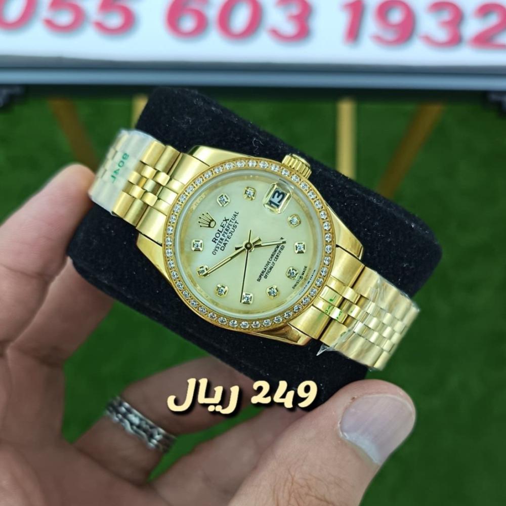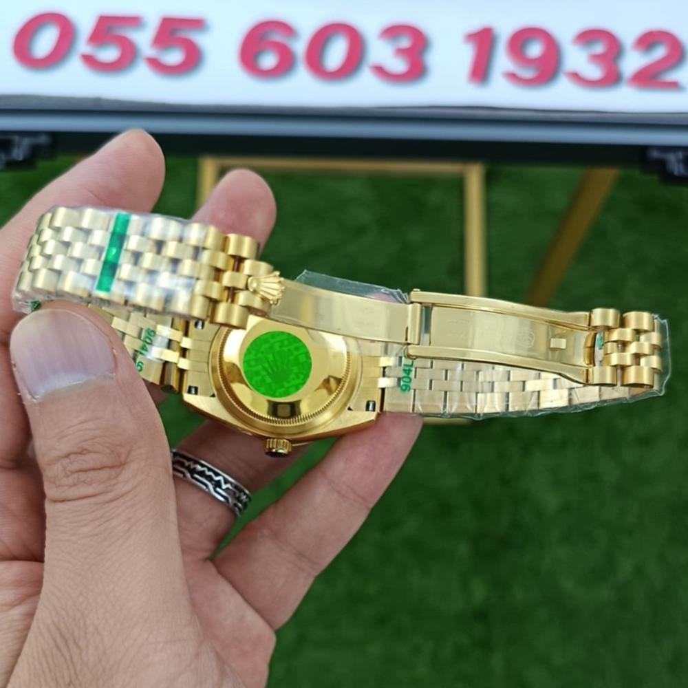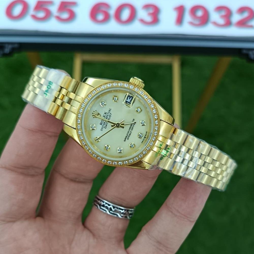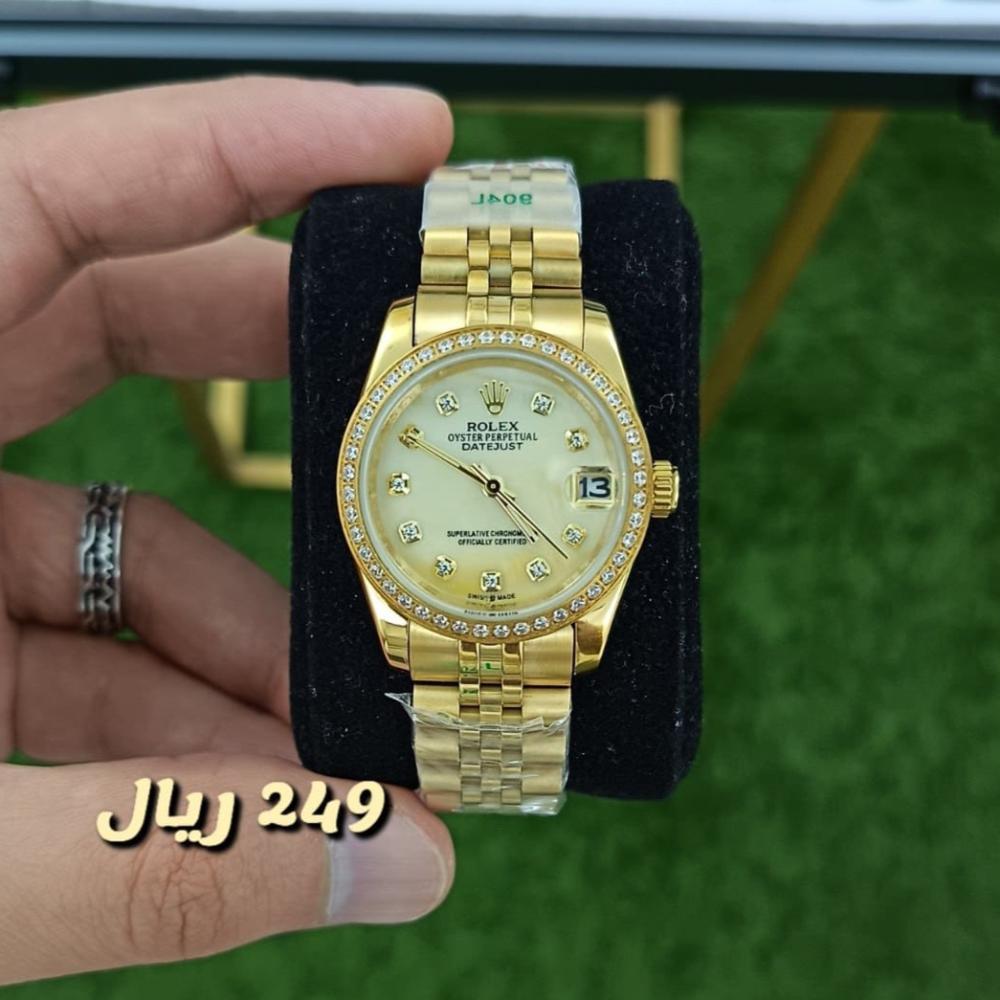 للي تدور ساعة راقية وفخمة 👌 ساعة رولكس ديت جست درجة أولى بطارية مقاس 31 بلون ذهبي لامع ✨ مرصعة بالأحجار على الإطار والميناء، تعطيك أناقة ما تنوصف وتناسب كل المناسبات.