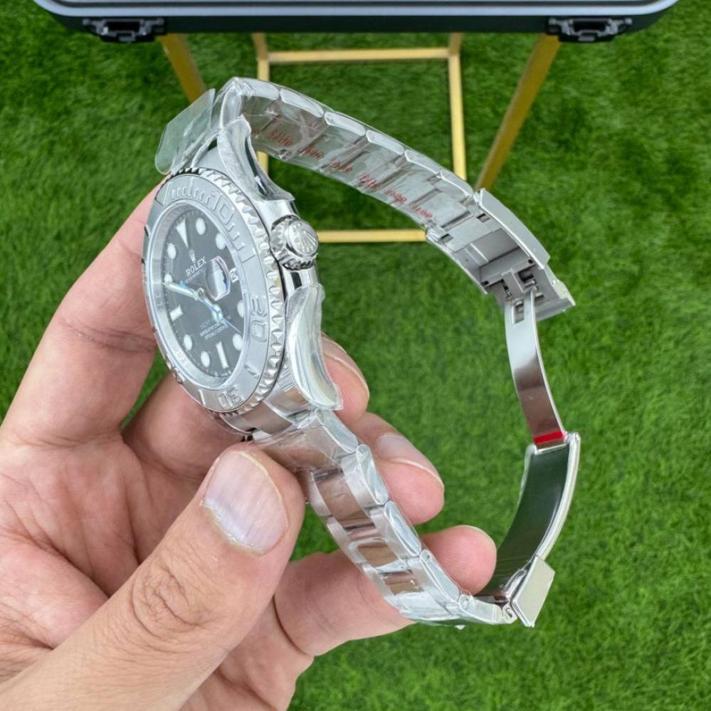 The Rolex Yacht-Master watch features a meticulous design that reflects a blend of performance and beauty. Made from stainless steel, its materials exude superior quality and long-lasting durability. The dial features a dark grey color, with luminous markers that provide exceptional legibility even in low light. The watch glass is scratch-resistant, ensuring that it maintains its luster and elegance with constant use. It is powered by a reliable automatic mechanism that ensures superior performance.