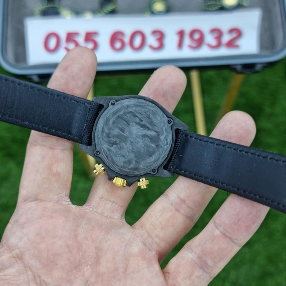رولكس دايتونا DIW تقليد درجة أولى، بإطار كربون أسود وأزرار ذهبية تعطيها لمسة فخامة غير. المينا جاي بنقشة كاربون مميزة، والماكينة أوتوماتيك تثبت لك جودتها كل مرة. وسوارها؟ قماشي أسود فخم ومريح على اليد. الساعة تجمع بين الطابع الرياضي والهيبة، وتناسب جميع الأذواق.